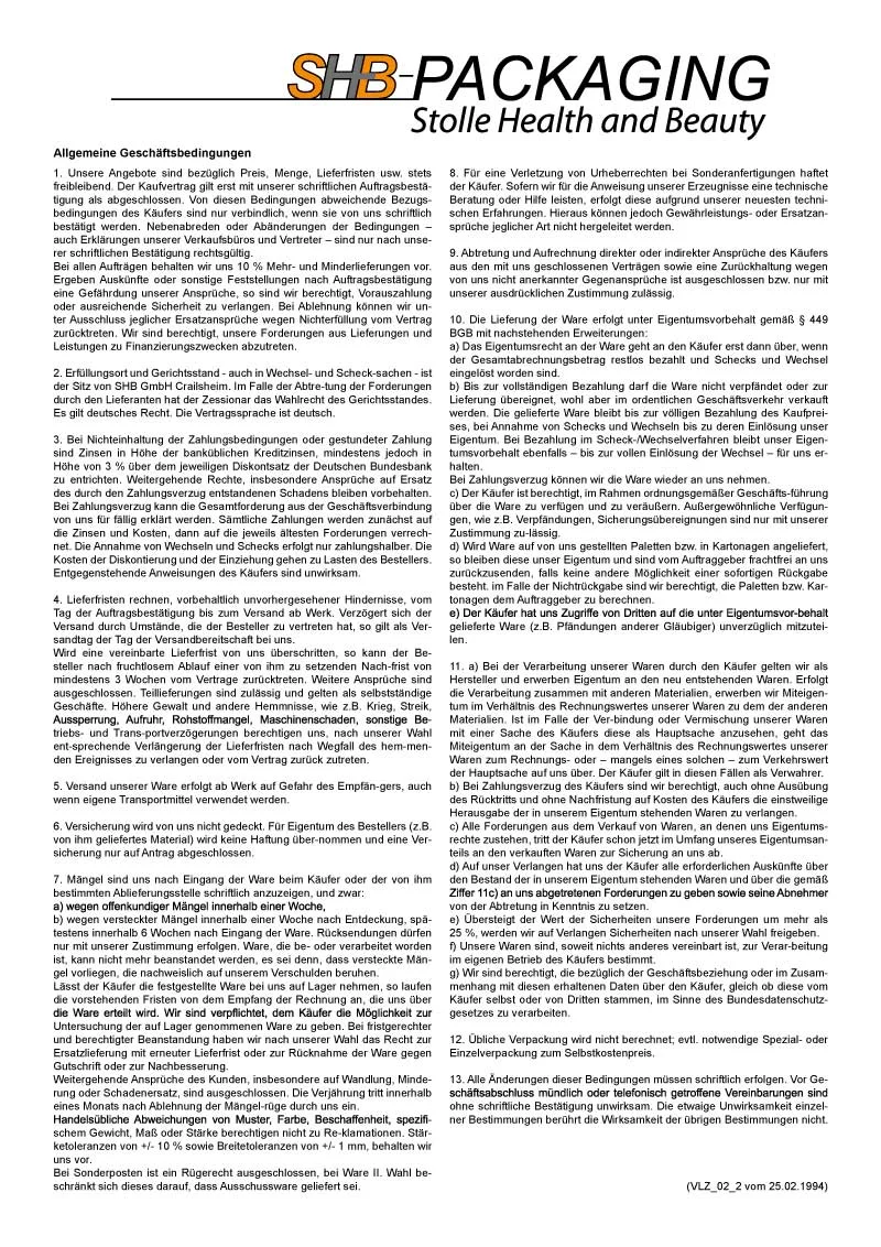 2. Erfüllungsort und Gerichtsstand - auch in Wechsel- und Schecksachen - ist der Sitz von SHB GmbH Crailsheim. Im Falle der Abtretung der Forderungen durch den Lieferanten hat der Zessionar das Wahlrecht des Gerichtsstandes. Es gilt deutsches Recht. Die Vertragssprache ist deutsch.